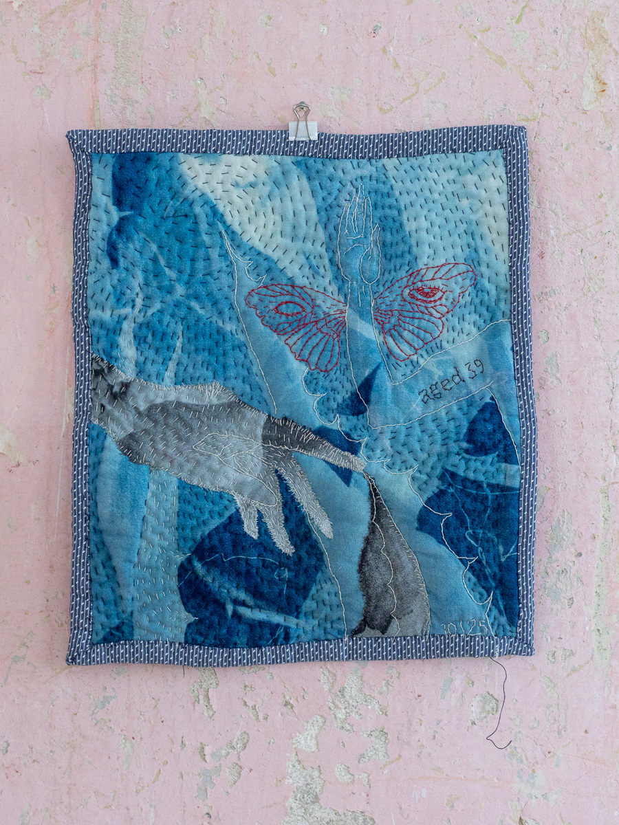 Cyanotypy on cotton, used fabrics, yarn
